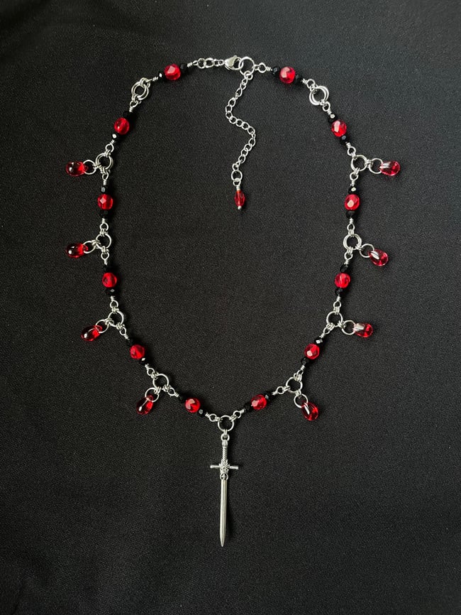 made with faceted glass beads, "blood drop" glass beads, and stainless steel